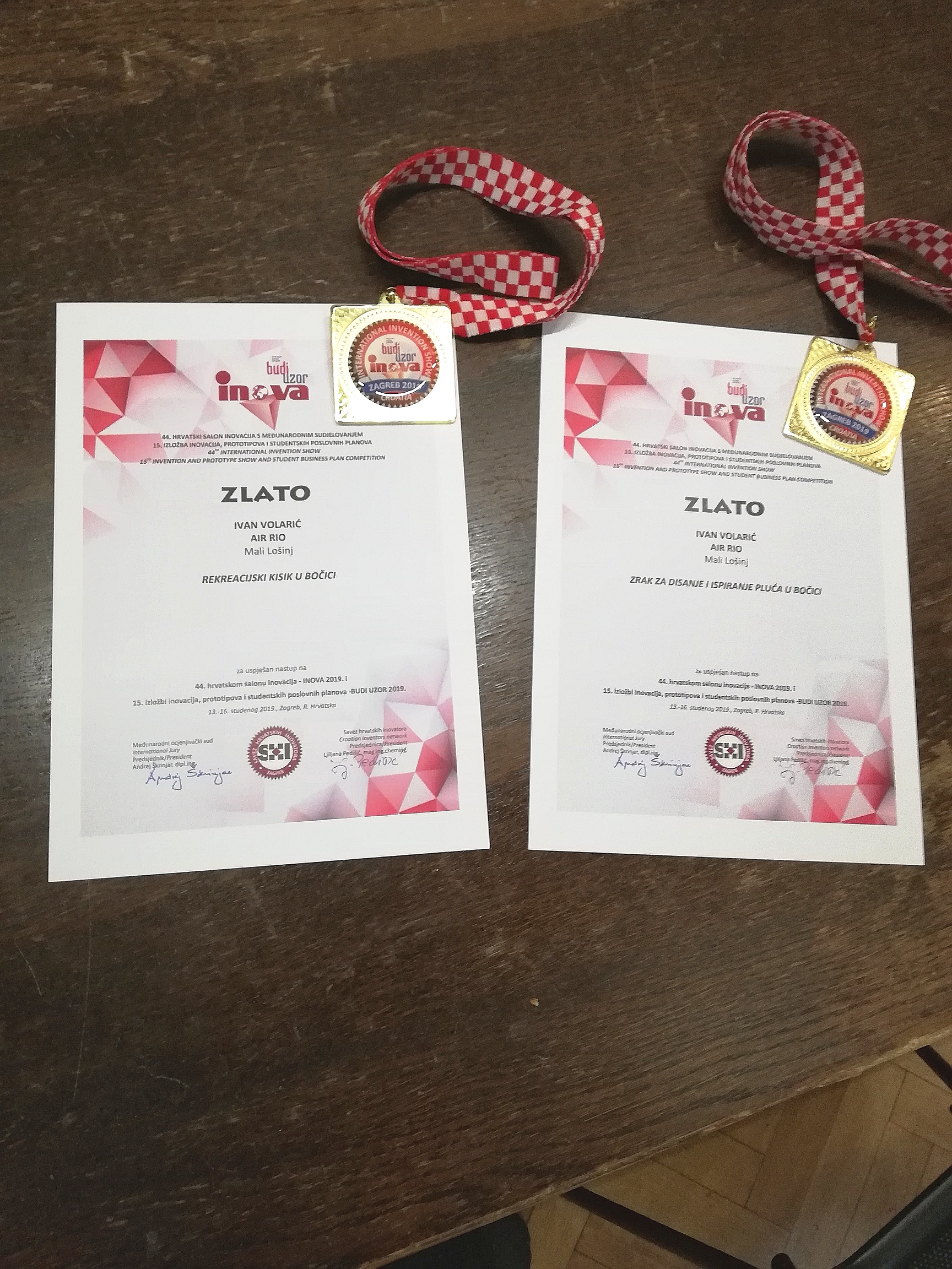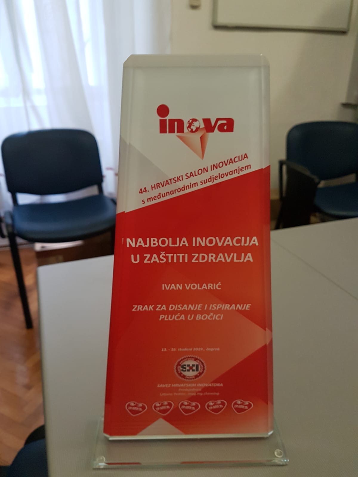 U studenom 2019. nastupili smo na sajmu inovacija INOVA – BUDI UZOR 2019. U Zagrebu, gdje je vlasnik obrta Ivan Volarić osvojio sljedeće nagrade: Zlato za svoj proizvod Zrak za disanje i ispiranje pluća u bočici, zlato za svoj proizvod Rekreacijski kisik u bočici te Najbolju inovaciju u zaštiti zdravlja za svoj proizvod Zrak za disanje i ispiranje pluća u bočici.