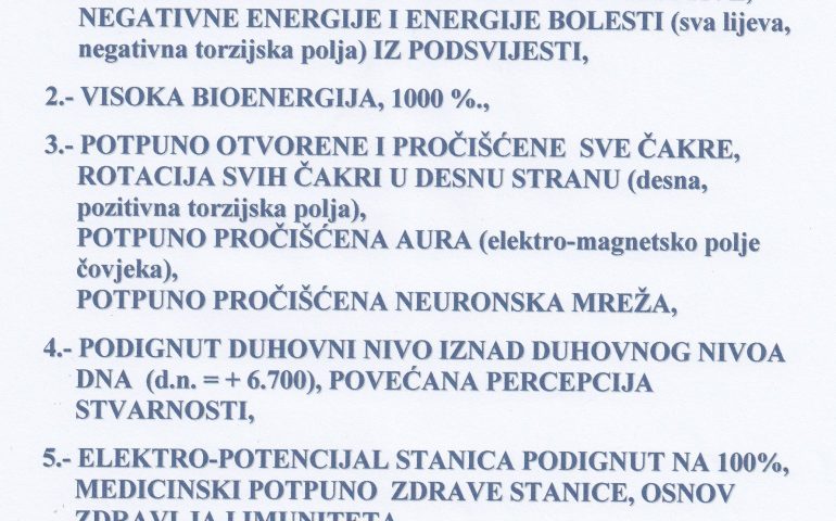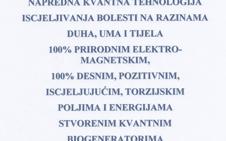 NAPREDNA KVANTNA TEHNOLOGIJA, ISCJELJIVANJA BOLESTI NA RAZINAMA DUHA, UMA I TIJELA 100% PRIRODNIM ELEKTRO- MAGNETSKIM,100% DESNIM, POZITIVNIM, ISCJELJUJUĆIM, TORZIJSKIM POLJIMA I ENERGIJAMA STVORENIM KVANTNIMBIOGENERATORIMA „ATLANTA“- PROSTORNI, OSOBNI, UNIVERZALNI