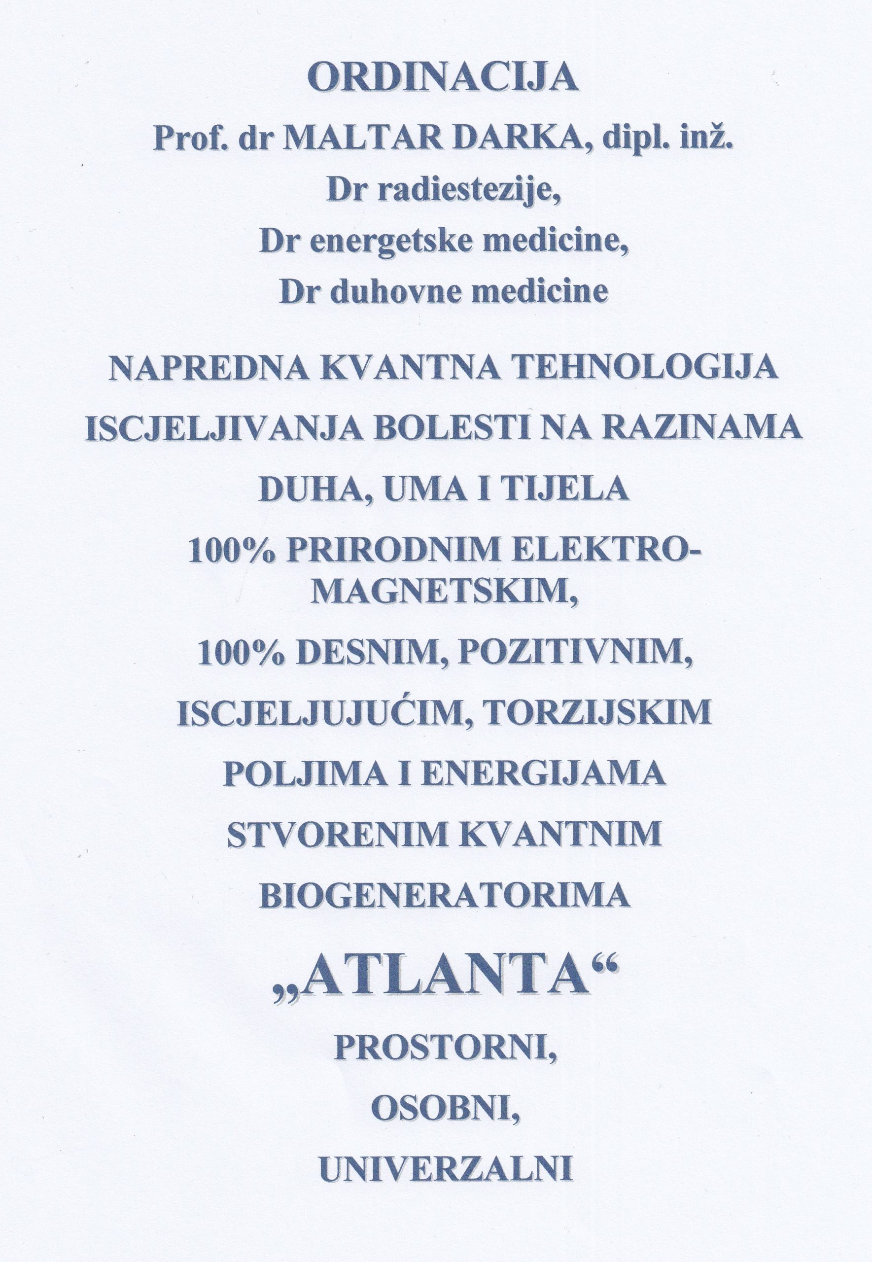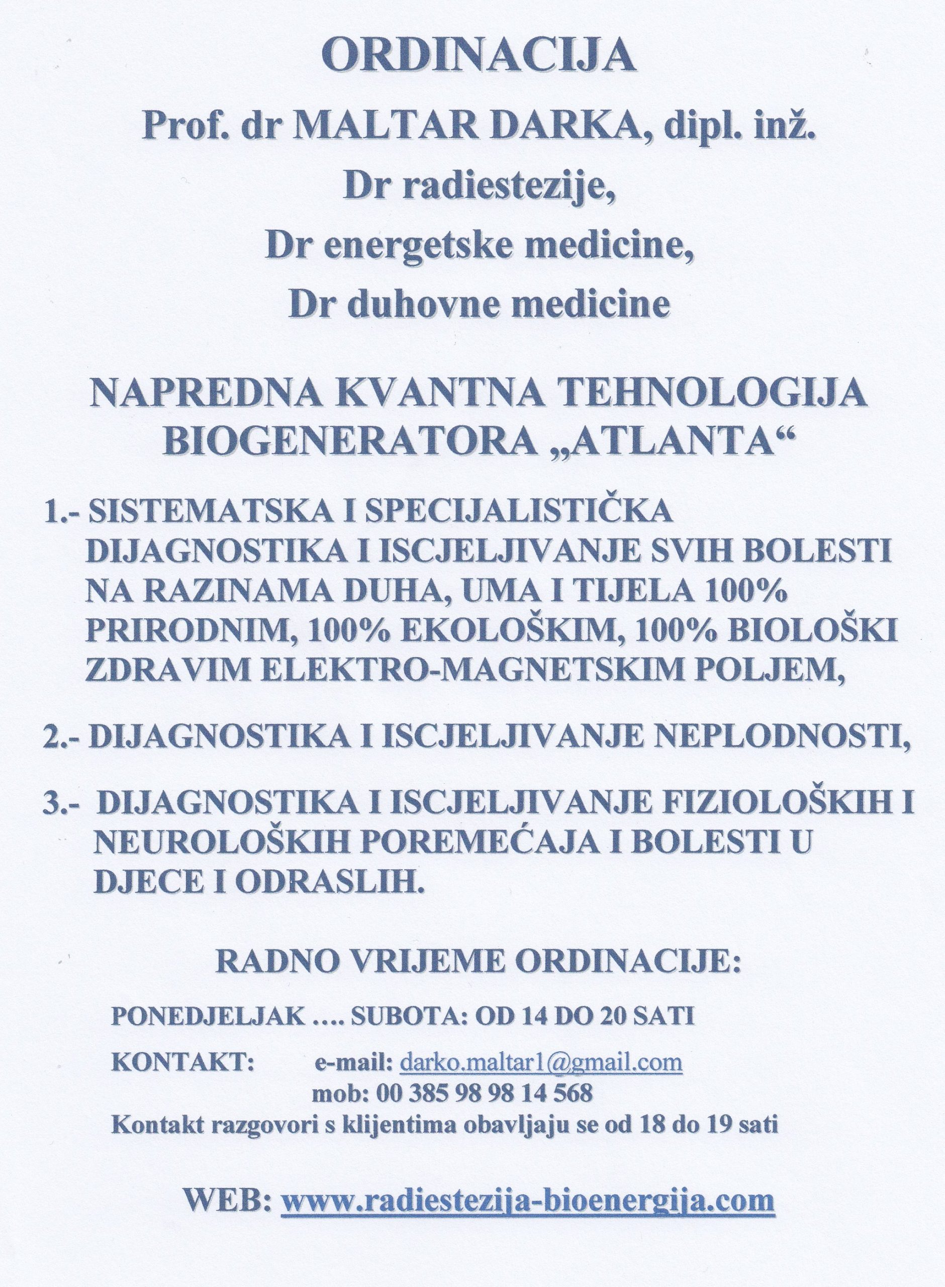 ORDINACIJA Prof. dr MALTAR DARKA, dipl. inž. Dr radiestezije, Dr energetske medicine, Dr duhovne medicine