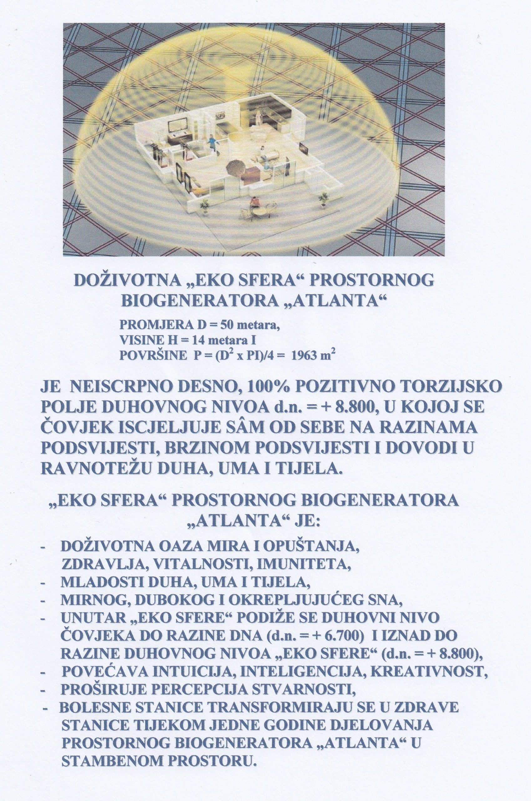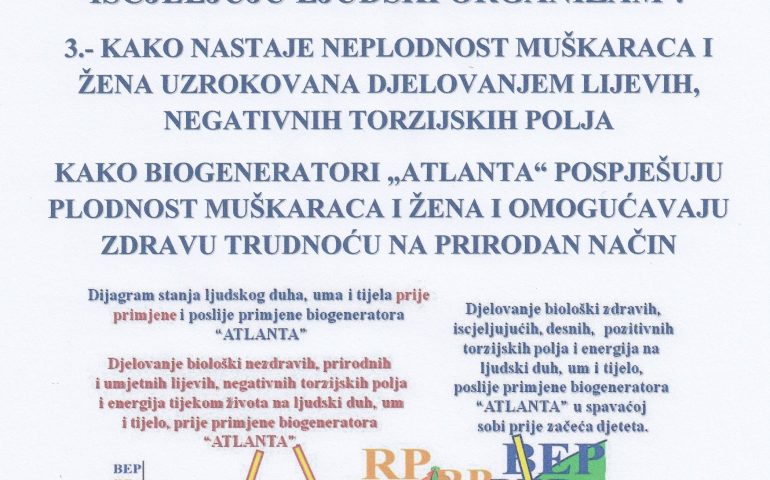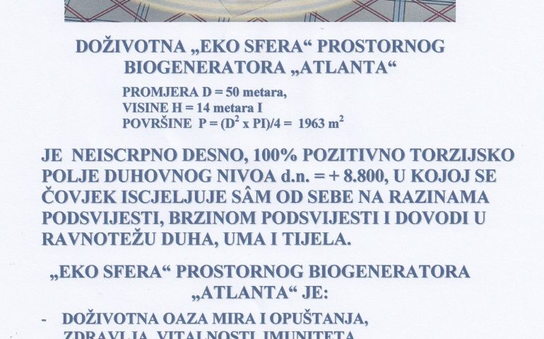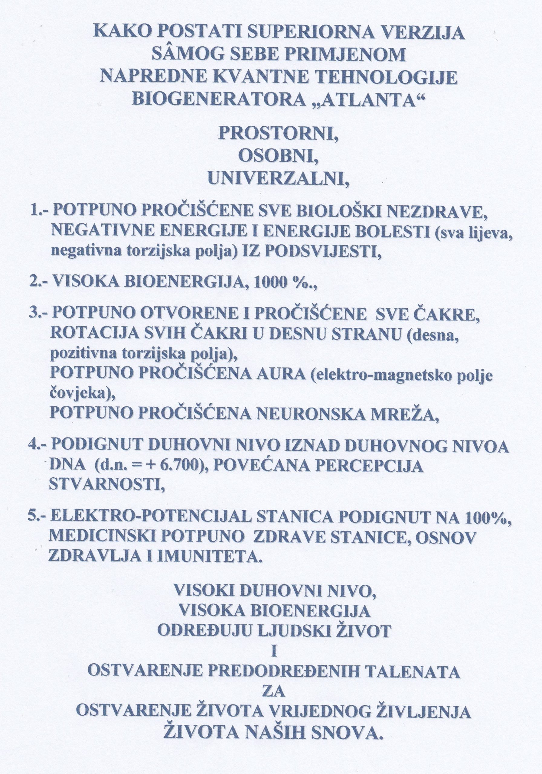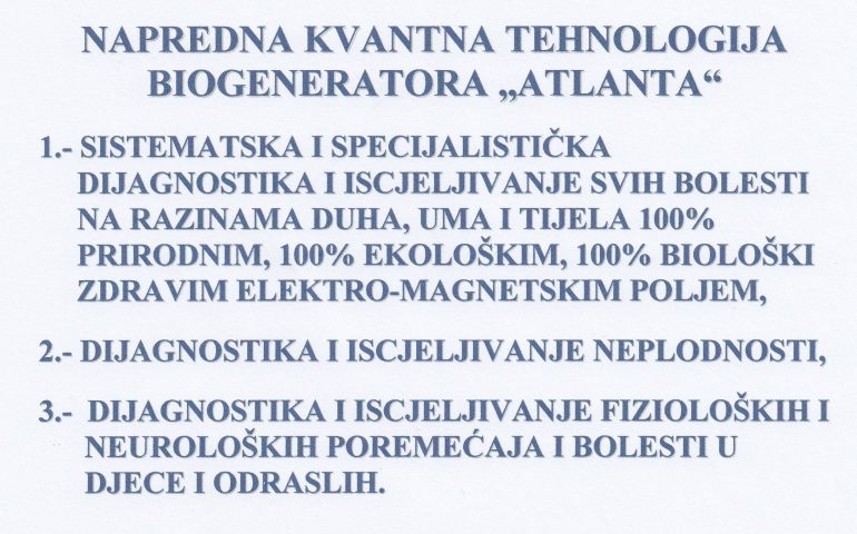 PRIMJENOM NAPREDNE KVANTNE TEHNOLOGIJE BIOGENERATORA „ATLANTA“- PROSTORNI, OSOBNI, UNIVERZALNI