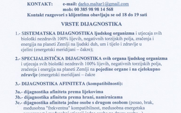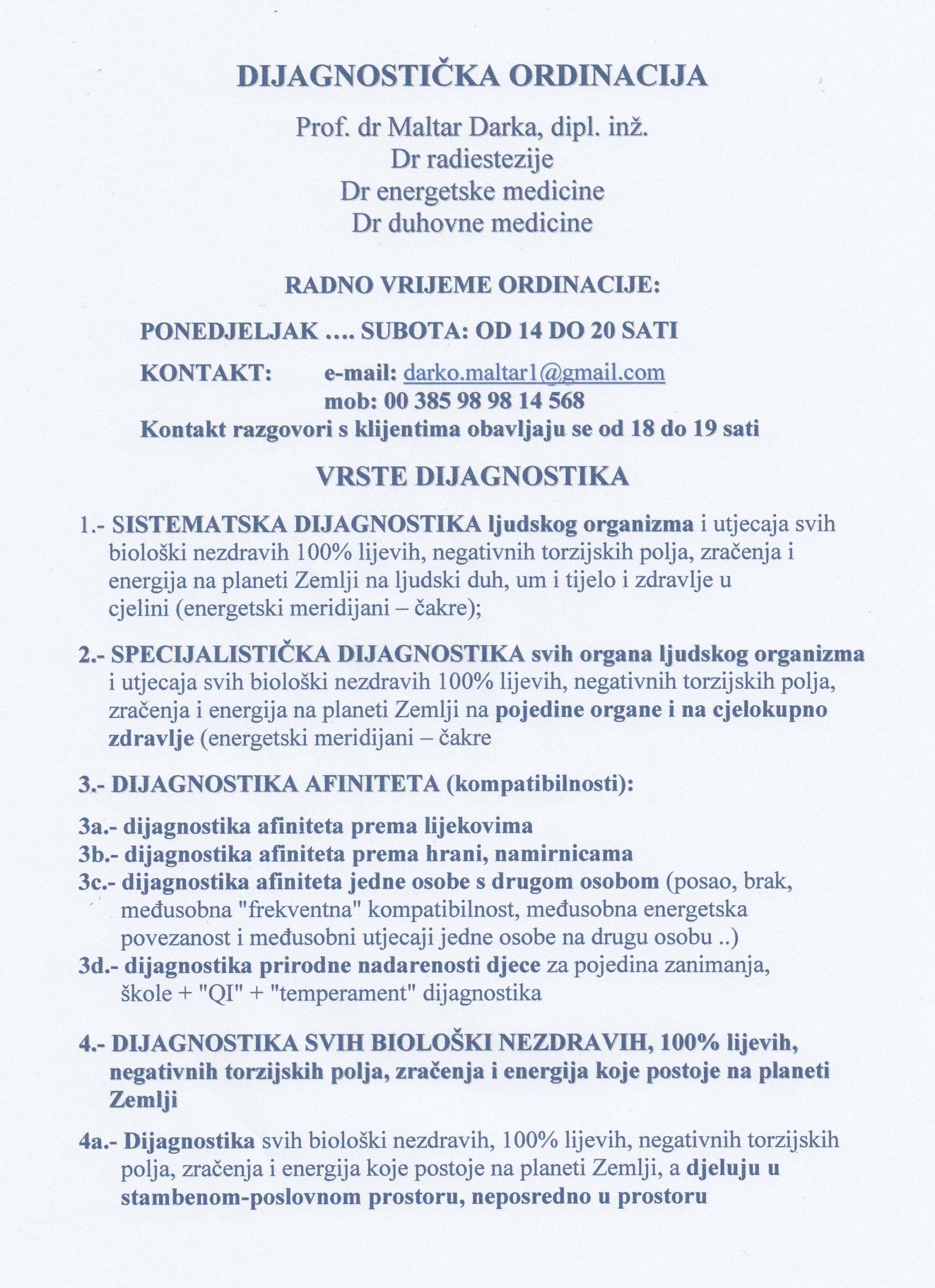 DIJAGNOSTIČKA ORDINACIJA Prof. dr Maltar Darka, dipl. inž. Dr radiestezije Dr energetske medicine Dr duhovne medicine